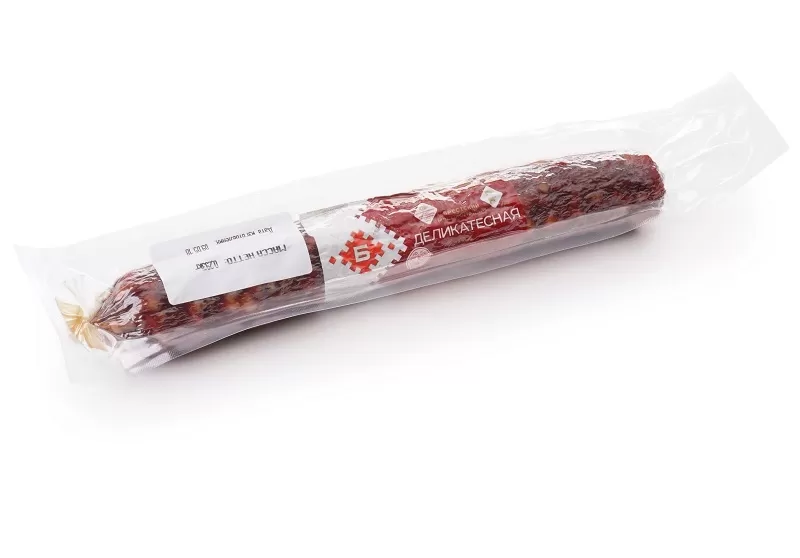 Колбаса сырокопчёная «Деликатесная» в газовой упаковке обладает мягким вкусом с идеально сбалансированным содержанием специй. Сырокопченая колбаса — продукт любимый многими. Обязательный гость праздничного стола, а некоторые не представляют завтрак без нее. Пряный аромат, умеренная жирность и разнообразие вкусовых оттенков завоевали любовь потребителей. Изготовленная с соблюдением технологии колбаса является деликатесом. Продукт замечательно вписывается в разные блюда, от бутербродов до нарезок.